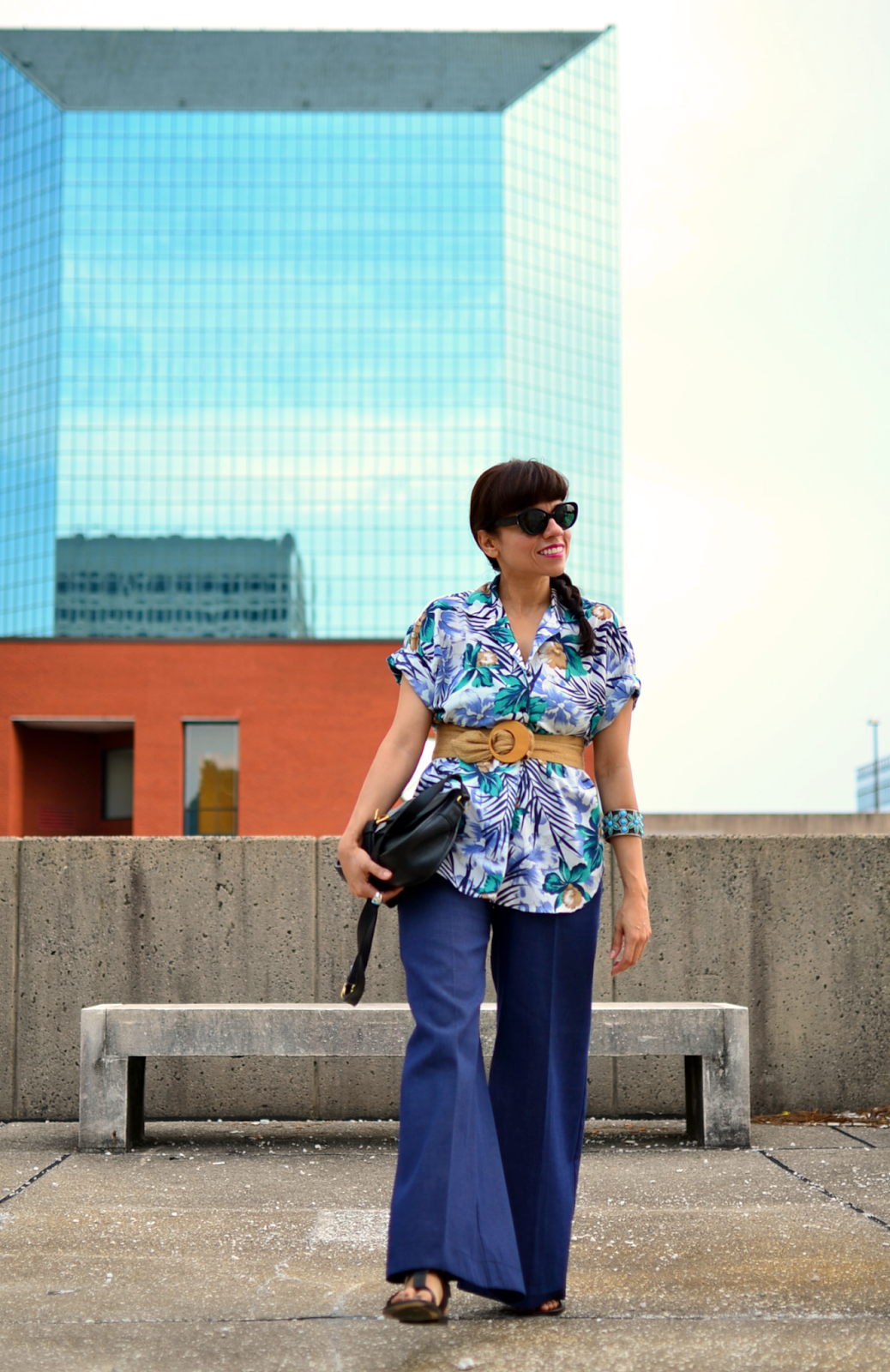 Having that tropical vacation mode in mind, however, I decided to wear this vintage Hawaiian shirt (recent purchase) with a pair of comfortable wide legged denim pants to enjoy my own downtown.