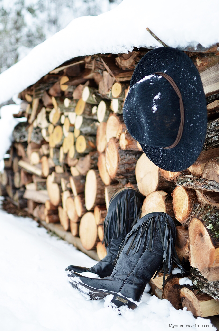 La semana pasada noté de que nuestro perro, Elvis, tenía extra energía debido a la nieve, lo que me hizo muy feliz, porque sabemos que echa de menos a Adobe, nuestro otro perro que tuvimos que decir adiós hace unos meses debido a su estado de salud. Elvis es casi 16 años como lo era Adobe, pero cuando sale a la calle y juega en la nieve, el actúa como un perro mucho más joven. Por lo tanto, no pude resistir la tentación de tomarnos fotos mientras jugábamos en nuestro pateo trasero. Realmente no tenía la intención de tener una sesión de fotos en la nieve profunda, por lo que yo todavía llevaba puesta la ropa conque anduve todo el día, sin embargo, después de la sesión de fotos, mis pantalones quedaron mojados, así que me puse unos pantalones vaqueros ajustados y mi botas para la nieve. Después de todo, me gusta mucho el resultado de las imágenes tomadas, incluso cuando llevaba los pantalones menos apropiados para la nieve, por cierto, las botas con flecos tenían suelas de goma, así que no tuve ningún problema caminando en la nieve.