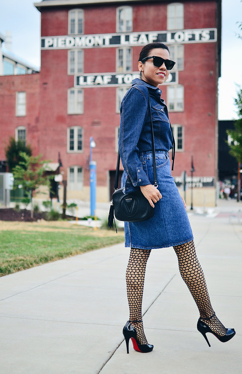 Today, I wanted to add dramatic notes to a denim on denim combo by wearing it with daring fishnet tights, lustrous stilettos, and a wrap choker. Who knew that the Canadian tuxedo can have a sexy side as well.